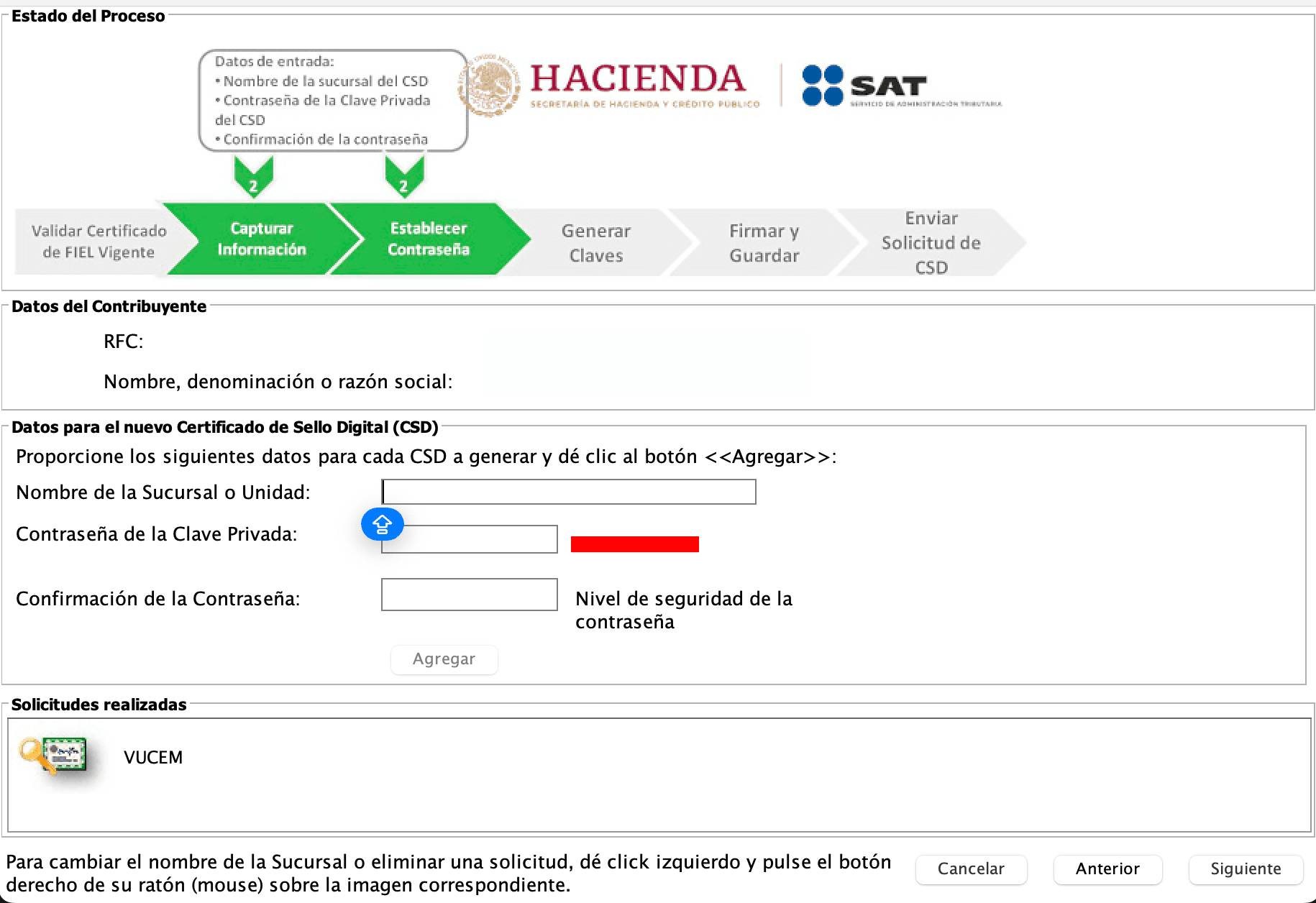 También deberás crear una contraseña para el sello en la sección “Contraseña de la Clave Privada”. Es importante que anotes esa contraseña porque será con ella que puedas acceder a la plataforma VUCEM más adelante.