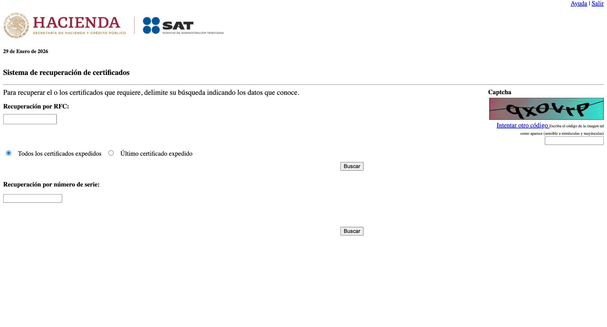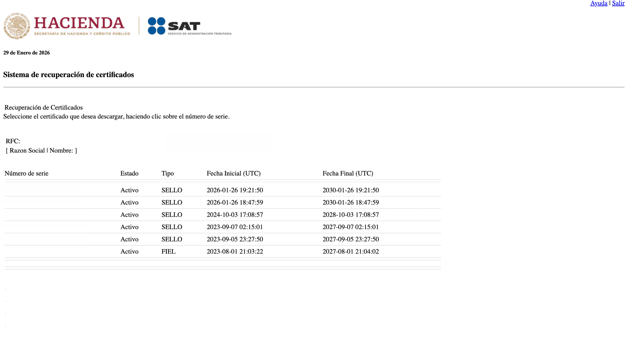 Acto seguido, el sistema te preguntará si quieres recuperar tus certificados por RFC o número de serie. De introducir RFC, como haremos en este tutorial, el sistema te retornará una lista de todos los certificados generados hasta la fecha con dicho RFC.