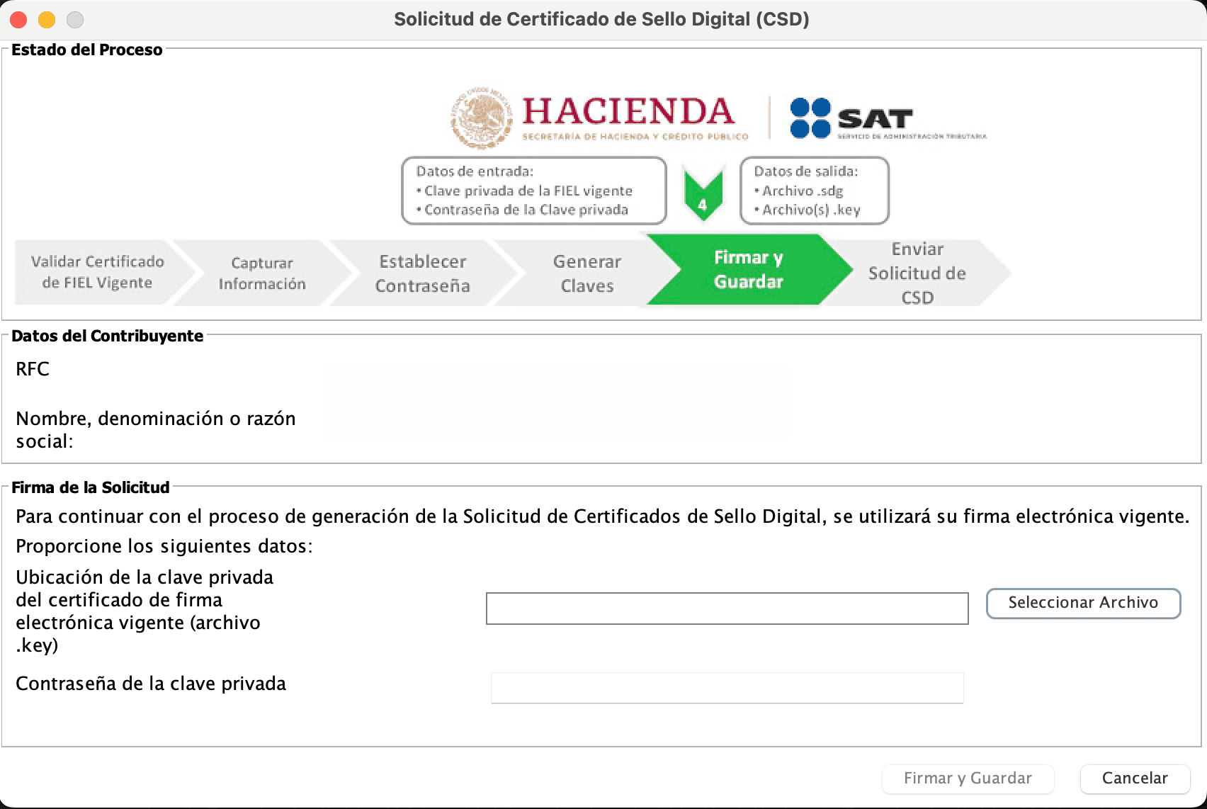 Una vez generados los certificados, el sistema te pedirá que firmes la solicitud usando tu Clave privada del certificado de firma electrónica vigente (archivo *.key) y la contraseña de tu firma electrónica. Para seleccionarla deberás presionar “Seleccionar Archivo” y seleccionar tu archivo *.key en el folder donde se encuentre. Acto seguido deberás colocar la contraseña de tu clave privada en el recuadro posterior.