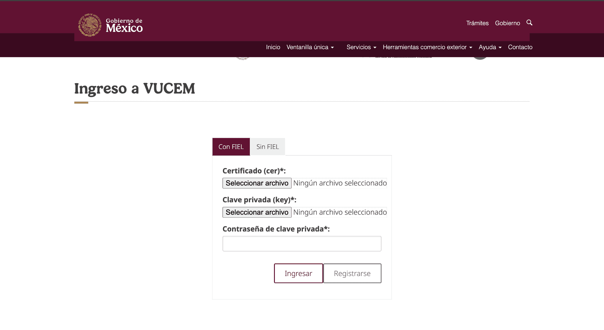 Una vez en la página, selecciona la opción para entrar con FIEL e introduce el archivo *.cer, el archivo *.key y la contraseña que generaste en los pasos anteriores. Con esa información, portadas acceder a la ventanilla única y generar procesos relevantes dentro de VUCEM.