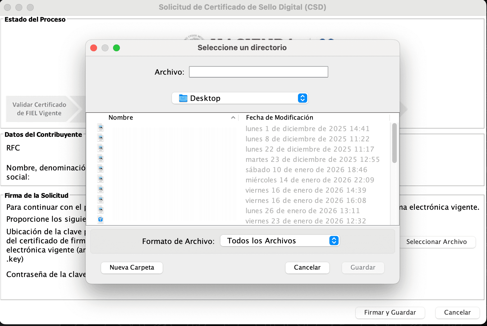 Una vez coloques tu archivo *.key y contraseña, el sistema te pedirá que selecciones un folder en tu computadora. En ese folder, el sistema descargará dos archivos: una Clave privada del certificado de firma electrónica vigente (archivo *.key) y un archivo sdg. Este último será esencial para generar sellos.