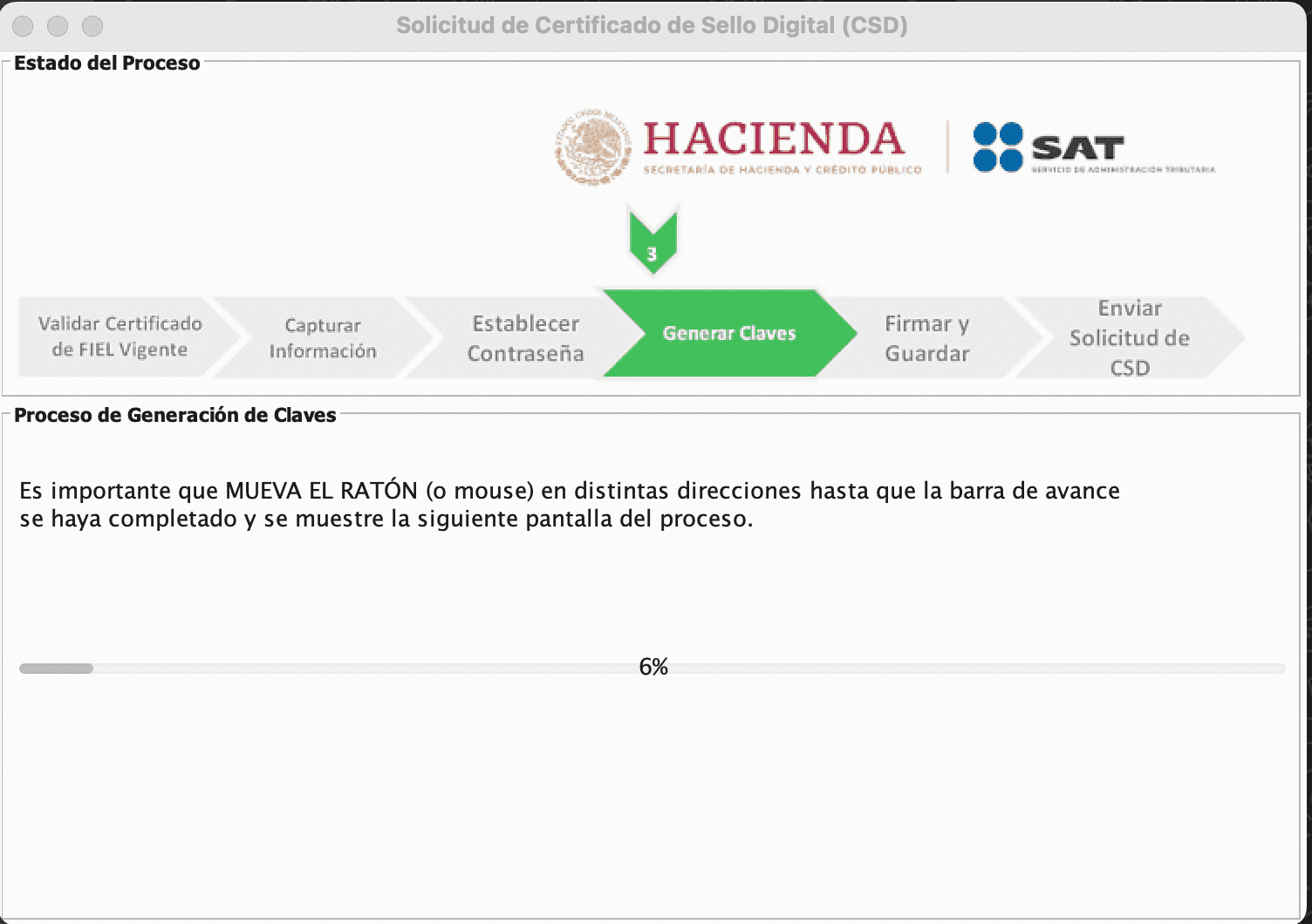 El sistema iniciará a generar claves de acceso automáticamente mostrando una barra de progreso. Certifica requiere que te mantengas en esa pantalla y muevas tu cursor sobre la pantalla para generar los certificados.
