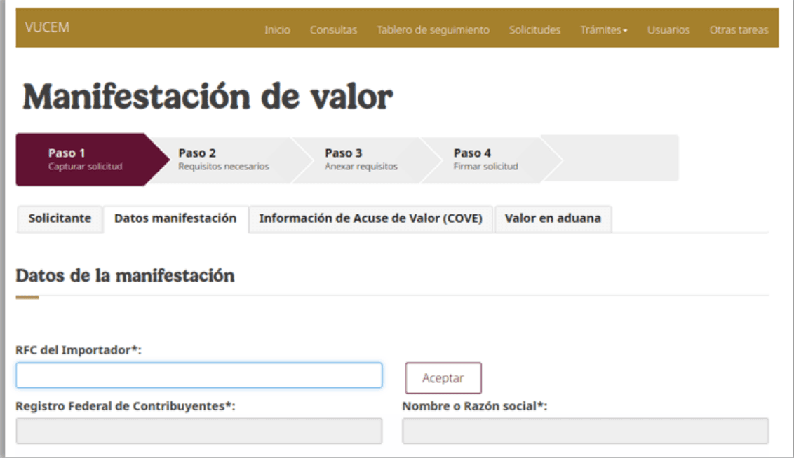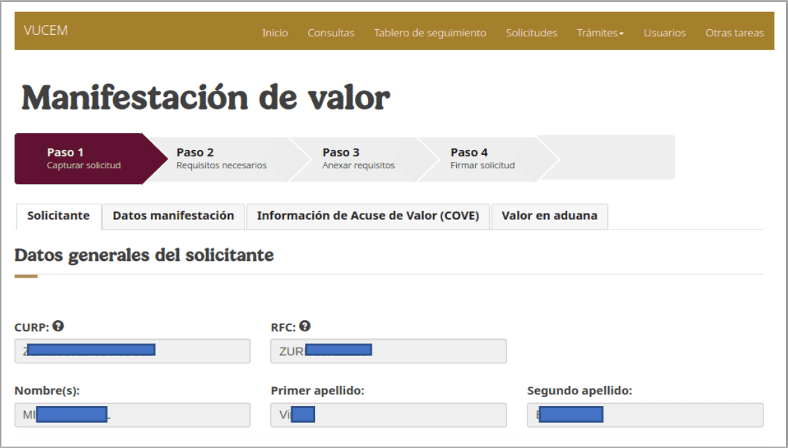 El portal de UCEM te redirigirá automáticamente a una pantalla que te guiará por cuatro pasos para presentar la Manifestación de Valor. El primero de ellos es capturar la solicitud, para el cual, deberás presentar información del solicitante.