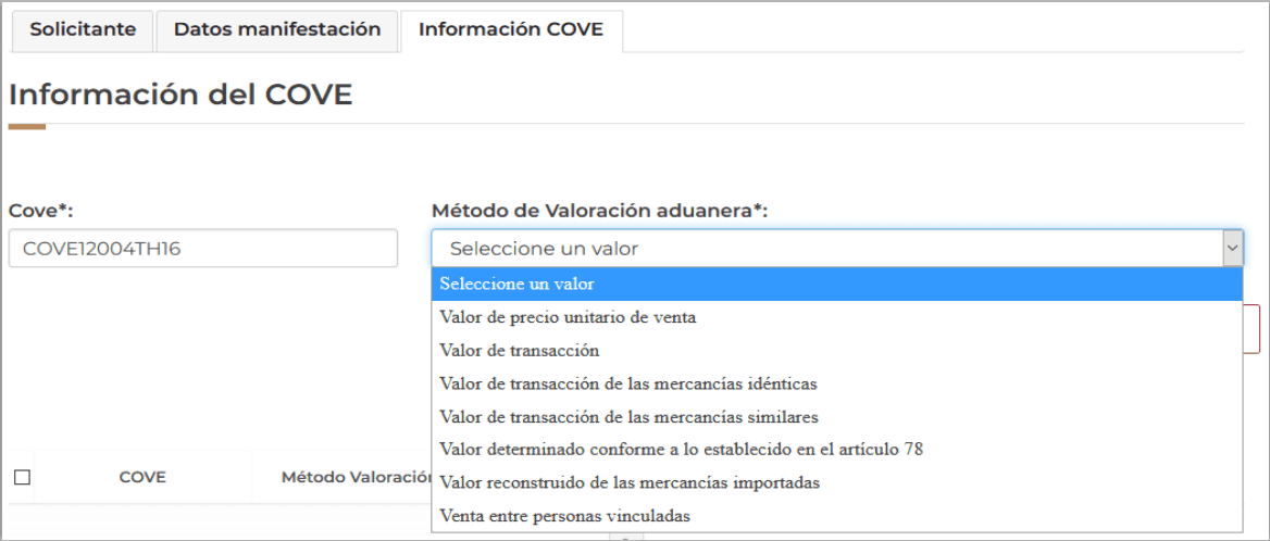 En la plataforma de VUCEM deberás ingresar el número de COVE y el método de valoración aduanera utilizado.