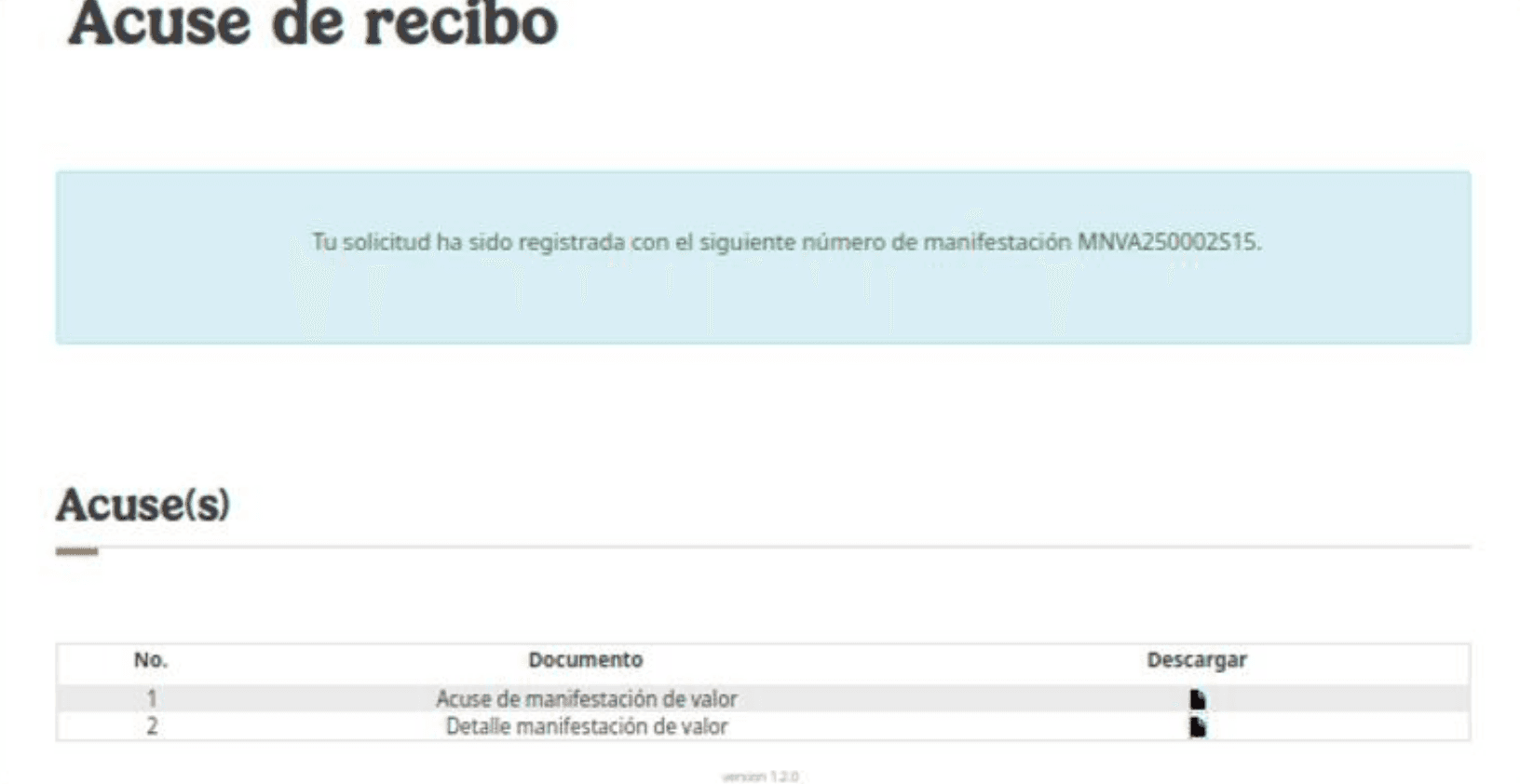 Una vez hayas subido las claves relevantes, VUCEM generará un Acuse de manifestación de valor y el detalle de manifestación de valor. En estos documentos encontrarás el número de manifestación de valor con el que podrás elaborar el pedimento aduanero.