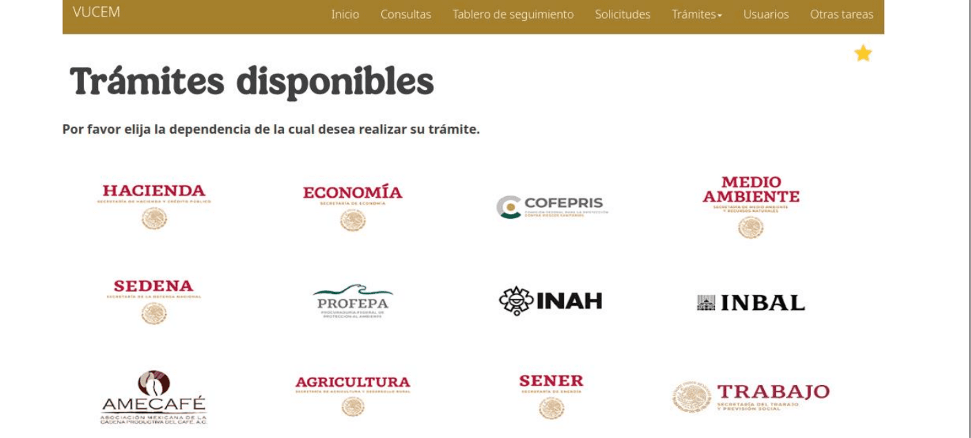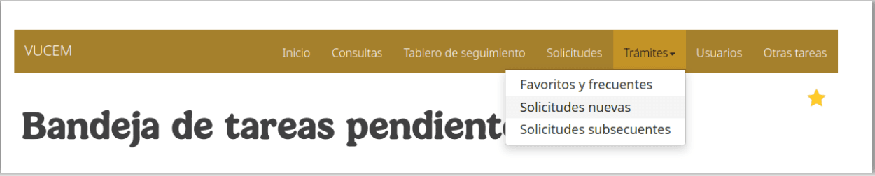 Una vez dentro de VUCEM, deberás presionar el botón “trámites” en el menú superior de la plataforma. Al presionarlo, aparecerá un menú secundario donde deberás presionar “solicitudes nuevas”.