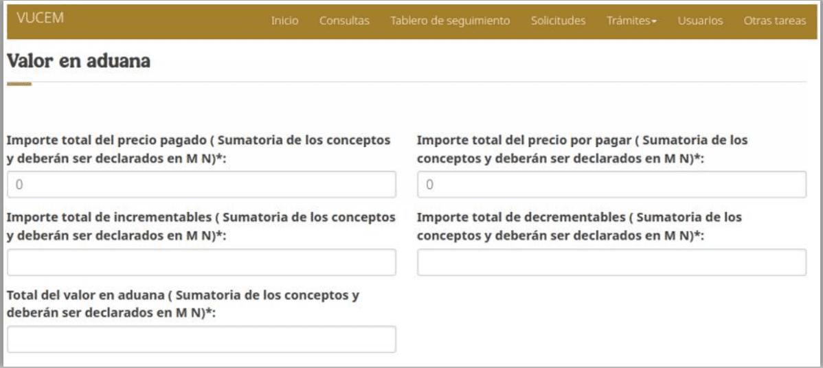Una vez hayas presentado toda la información del COVE puedes pasar a la última pestaña de la captura de tu solicitud: Valor en Aduana. En esta ventana, deberás presentar la información del valor monetario de la mercancía importada, divida en: