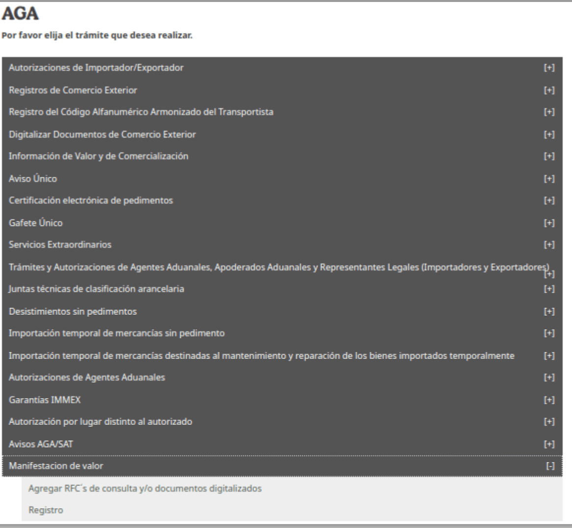 Dentro de las opciones que presenta la Secretaría de Hacienda en el menú AGA, debes presionar “Manifestación de Valor” y, acto seguido, presionar “Registro” en el menú secundario que aparece. Con esto, iniciará oficialmente el trámite de la Manifestación de Valor Electrónica.