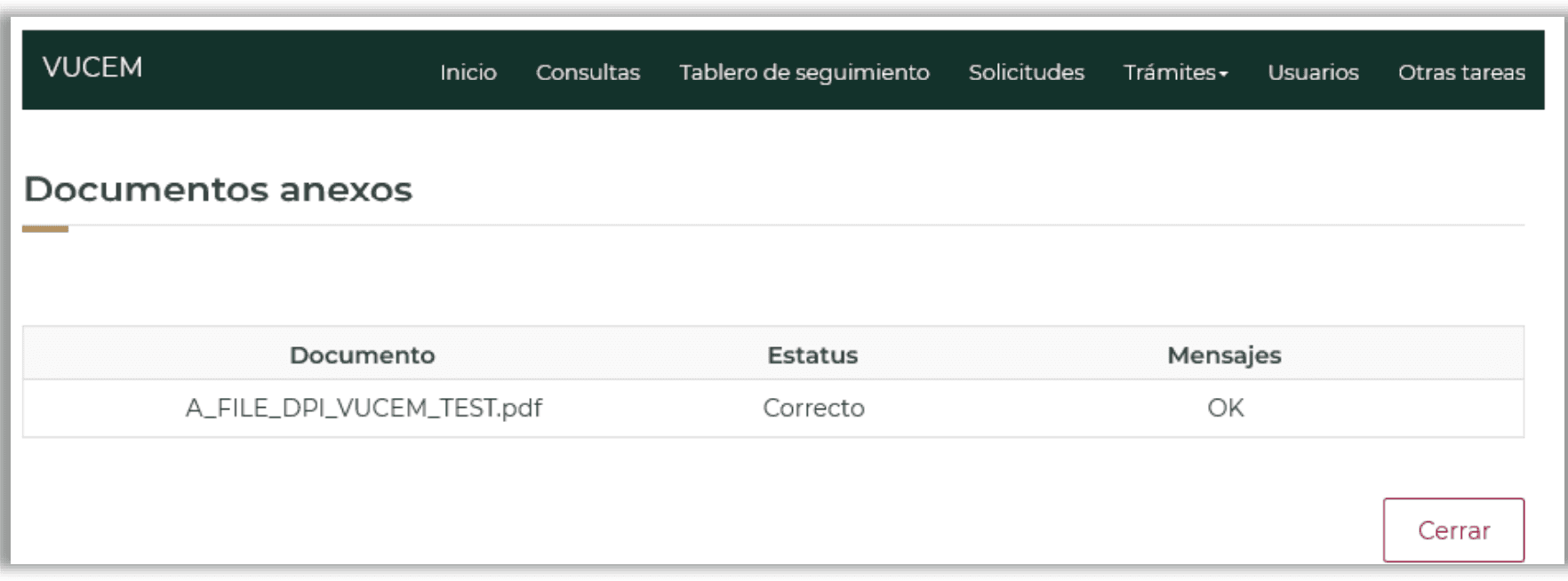Una vez hayas subido un documento, CIVEM abrirá una pestaña adicional donde indicarán que el estatus es “Correcto”.