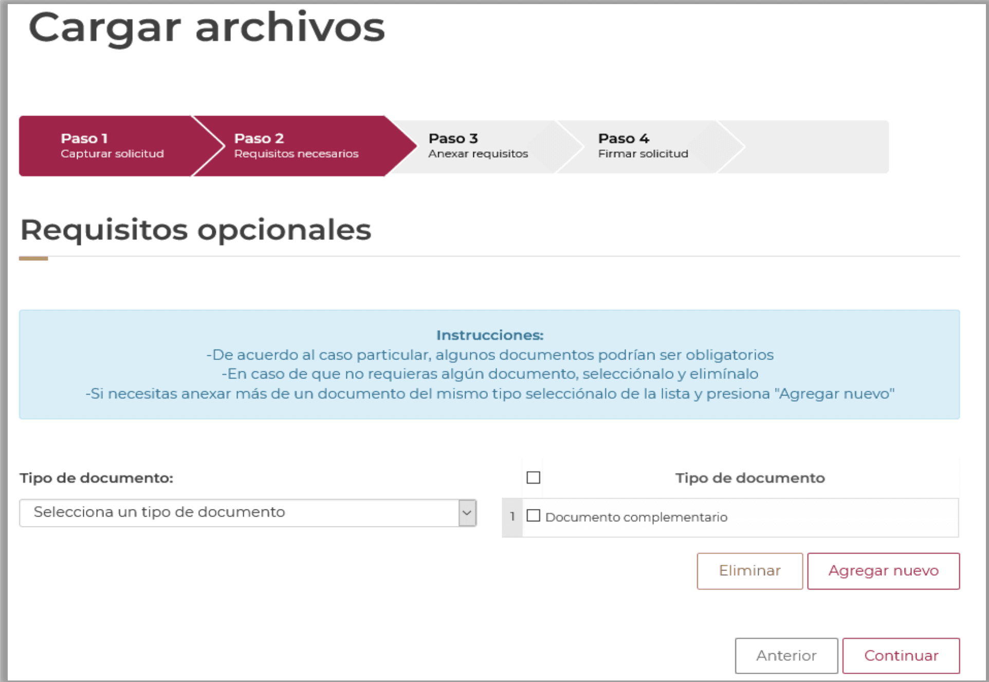 Ahora que has terminado con la captura de tu solicitud, pasarás a especificar los documentos que son relevantes para tu Manifestación de Valor. En este paso, solo debes especificar los documentos y su tipo. Subirlos será el siguiente paso.